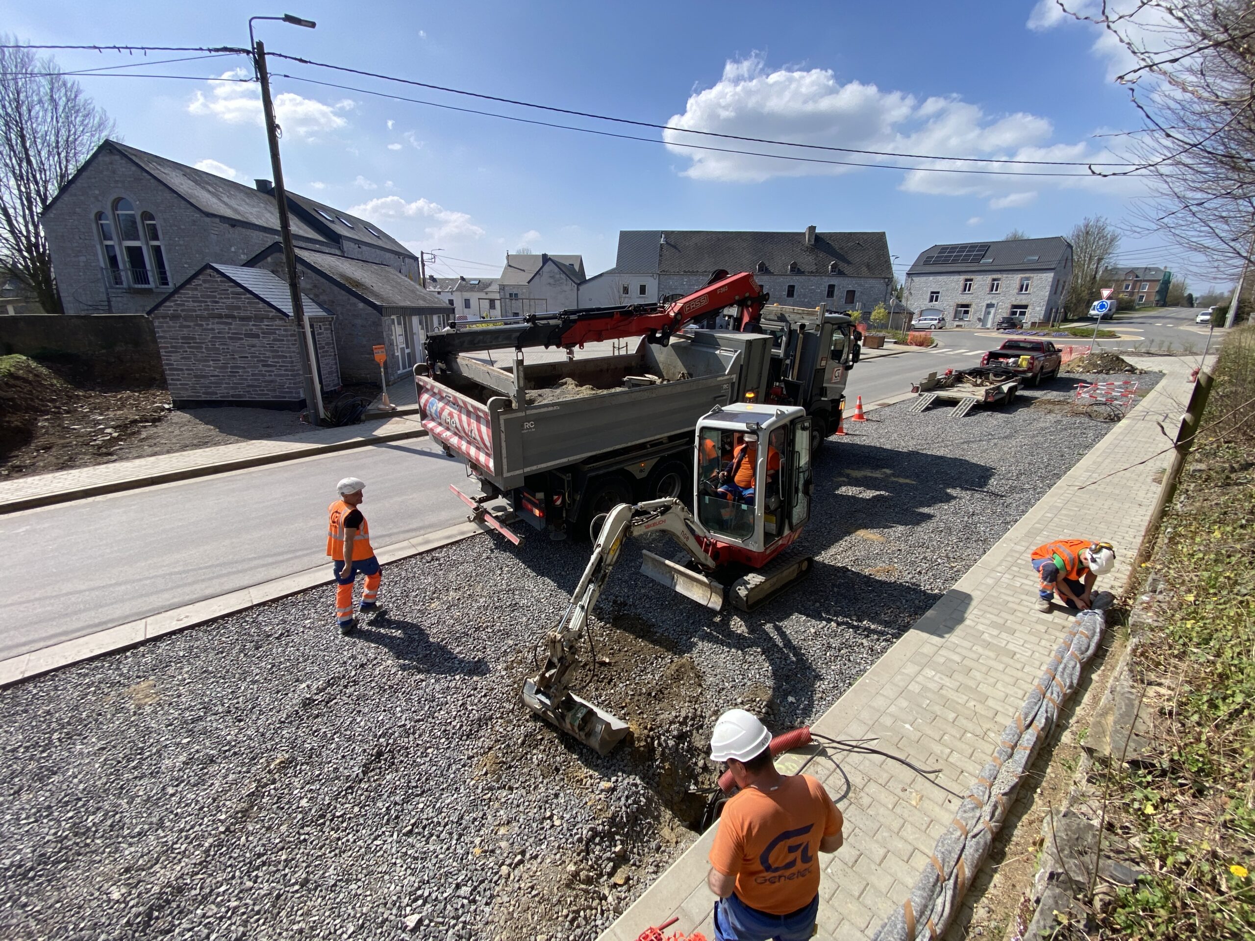 Le village d'Emptinne, à Hamois, vient de rénover l'aménagement de sa place. Nous avons posé la cerise sur le gâteau : les poteaux et les éclairages. "L'entreprise d'aménagements a posé les câbles et ORES nous a demandé de nous occuper de l'éclairage", indique notre conducteur de chantiers en Basse Tension Aérienne et Éclairages publics.