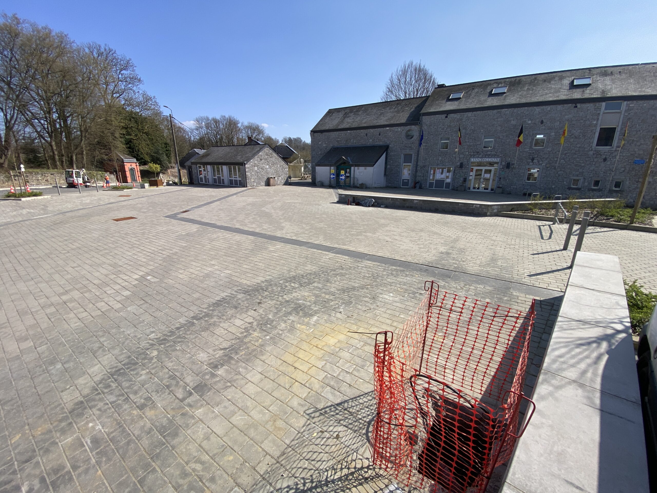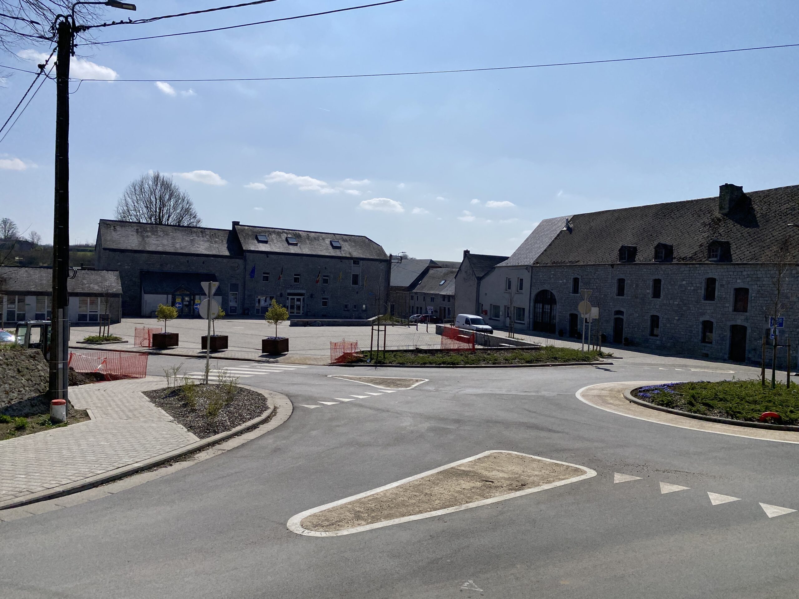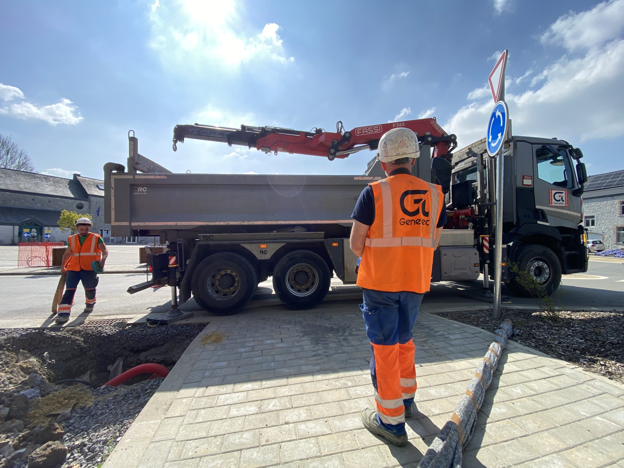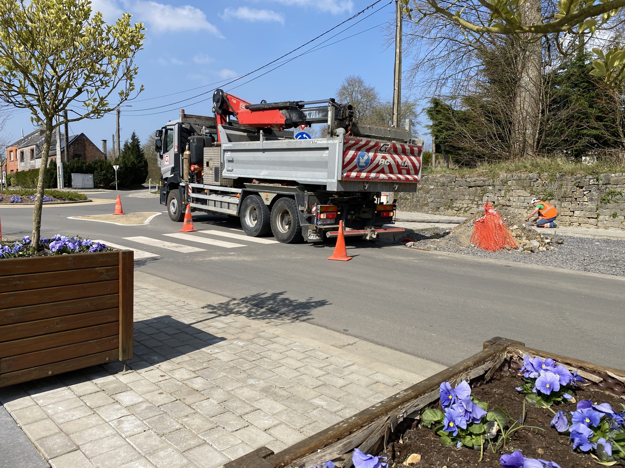 Le village d'Emptinne, à Hamois, vient de rénover l'aménagement de sa place. Nous avons posé la cerise sur le gâteau : les poteaux et les éclairages. "L'entreprise d'aménagements a posé les câbles et ORES nous a demandé de nous occuper de l'éclairage", indique notre conducteur de chantiers en Basse Tension Aérienne et Éclairages publics.
